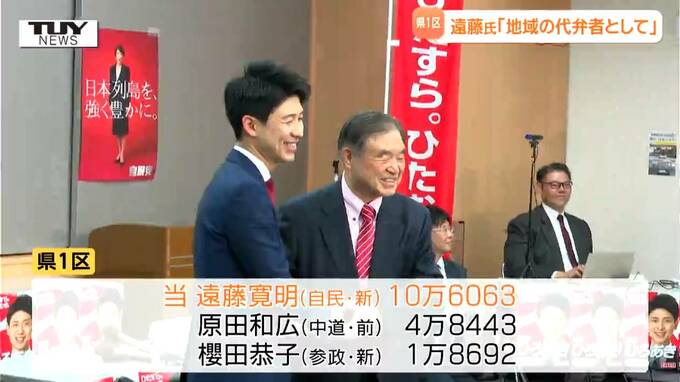 県1区の開票結果です。自民党の新人・遠藤寛明さんが中道改革連合の前職・原田和広さんに5万7000票あまりの大差をつけて三つ巴の争いを制しました。