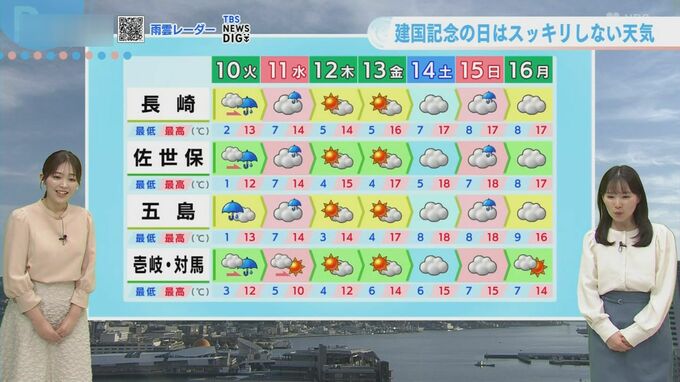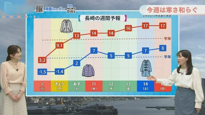 きのう8日(日)は長崎市でマイナス1.5度まで冷え込み、雪も降る厳しい寒さとなりました。今朝もマイナス1.4度まで下がりましたが、きょう9日(月)の日中は9.7度まで上昇。この先の気温はさらに上昇し、特に13日(金)以降は最高気温17度前後と「3月下旬並み」の春の陽気となる見込みです。