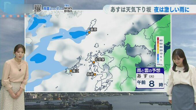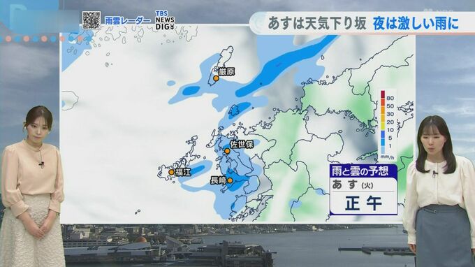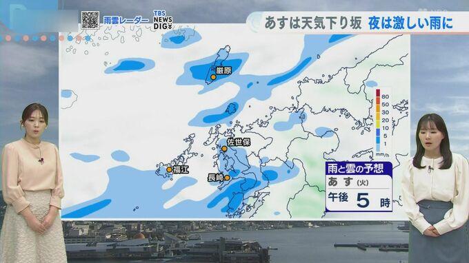 「あす日中は局地的に降ったり止んだりというお天気になりそうで、しっかりと広い範囲で降るのは夜になってから」と平地さん。夜間は雷を伴う激しい雨となるおそれもあるため、「出るときに雨が降っていなくても明日は雨具をお持ちください」とアドバイスしています。