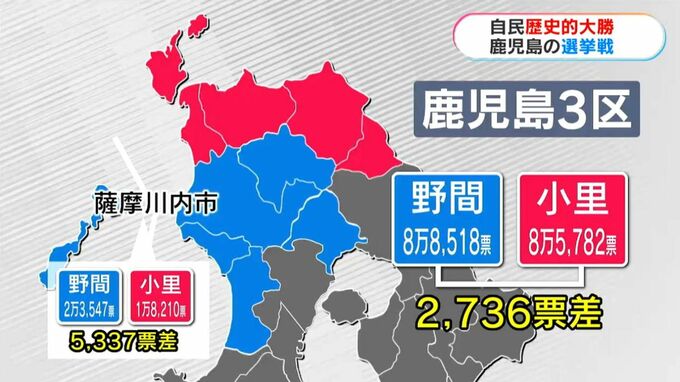 (記者)中道改革連合前職の野間さんと自民党元職の小里さんが選挙区内10の市と町の半数ずつで勝利を分け合いましたが、野間さんが票田の薩摩川内市で小里さんを引き離し、2736票差で勝利しました。