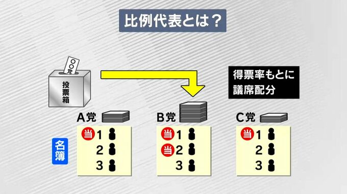 (記者)比例代表は政党名を書いて投票し、得票数を元に議席が配分される制度で、各党の名簿が上の人から当選します。