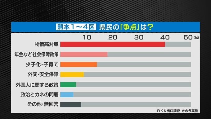 今回の選挙で熊本1区~4区の有権者が重視した争点は「物価高対策」が約40%と最多でした(RKK熊本放送の出口調査から)。