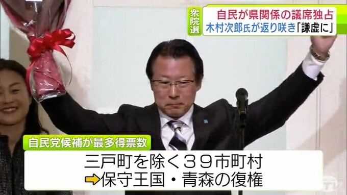市町村別では、三戸町を除く39市町村で自民党候補が最多得票数となり、保守王国・青森の復権を印象付けました。