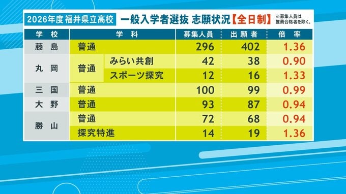 【全校の倍率2026】福井県立高校入試「一般入試」羽水・探究特進科が4.12倍 高志・探究創造科が1.98倍…令和8年度の出願状況 北陸放送 2026年2月9日(月) 18:43 国内 【学校別の一覧】藤島・普通 1.36倍、勝山・探究特進 1.36倍 ▼藤島:普通 1.36倍 ▼丸岡:普通 みらい共創 0.90倍、普通 スポーツ探究 1.33倍 ▼三国:普通 0.99倍 ▼大野:普通 0.94倍 ▼勝山:普通 0.94倍、探究特進 1.36倍