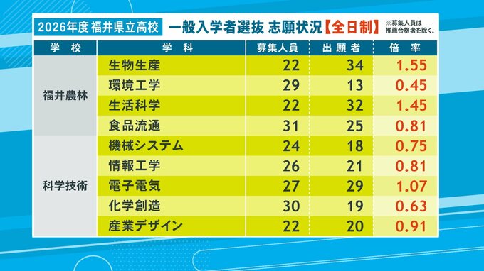 【学校別の一覧】福井農林・生物生産 1.55倍、福井農林・生活科学 1.45倍