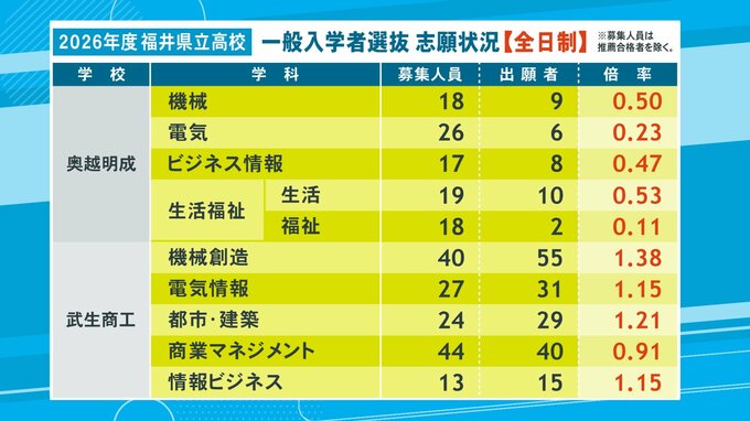 【学校別の一覧】武生商工・機械創造 1.38倍、武生商工・都市・建築 1.21倍
