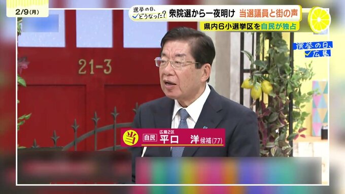 その他、広島1区は岸田文雄さん、4区は新谷正義さん、6区は小林史明さん(いずれも自民・前職)が当選しました。県内の小選挙区で自民党がすべての議席を独占するのは、1996年に現在の選挙制度が導入されて以降、初めてとなります。
