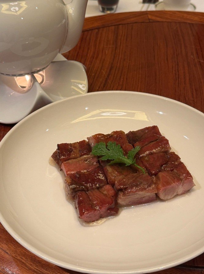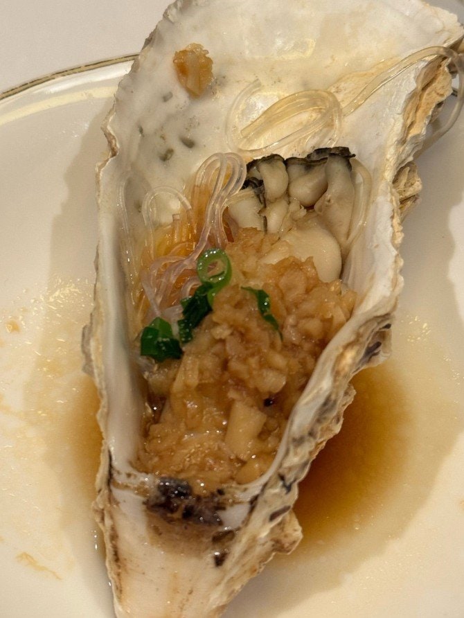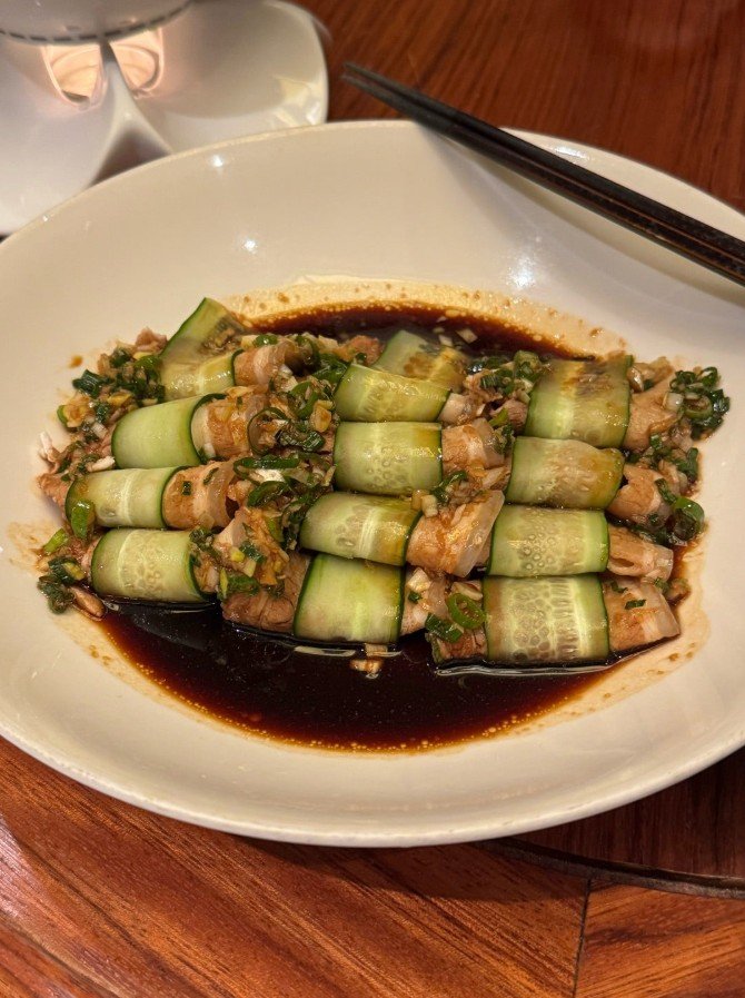 ディナーでは、はちみつチャーシュー、ピリ辛の薄切り豚、牡蠣のガーリック、北京ダック、担々麺などの豪華料理を写真付きで紹介。