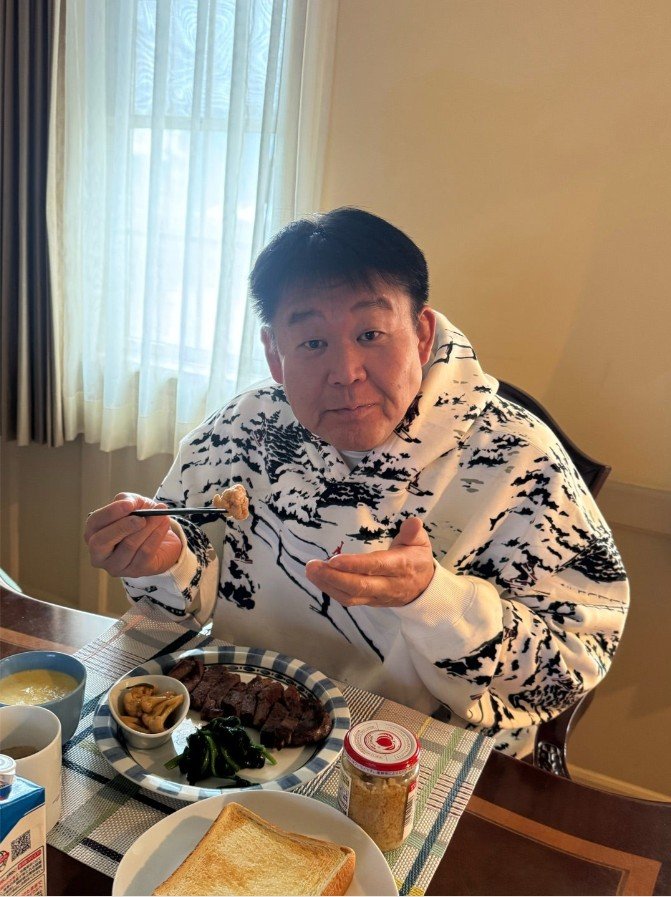 朝食の投稿では「ほぼ夕食」というタイトルで、特大のステーキを中心としたメニューを紹介。花田さんは「今日の朝食はほぼ夕食 食べないといけないものが色々とあってこうなりました なんかすみません」と、食材を無駄にしないための「豪華な朝食」になった経緯を説明しました。