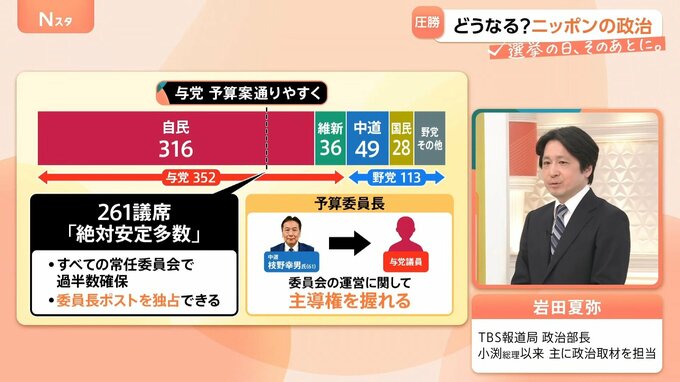 衆院選の結果、自民党だけで「絶対安定多数」とされる261議席を超えているため、▼すべての常任委員会で過半数を確保でき、▼委員長ポストを独占できることになります。