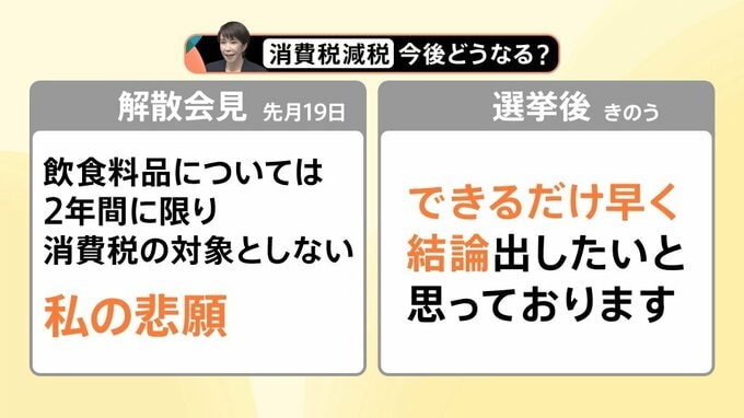 高市総理は1月19日、解散会見で「飲食料品については2年間に限り、消費税の対象としない。私の悲願」だと発言。強い思いを持っていることが分かります。