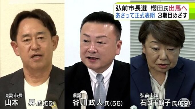 弘前市長選には、これまでに元副市長の山本昇氏、県議の谷川政人氏、市議の石岡千鶴子氏が出馬を表明しています。このほか共産党が候補者の擁立を検討しています。