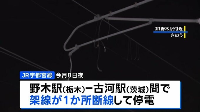 JR宇都宮線は今月8日の夜、栃木県の野木駅と茨城県の古河駅の間で架線が1か所断線して停電が起き、一部区間でおよそ17時間にわたり運転を見合わせました。