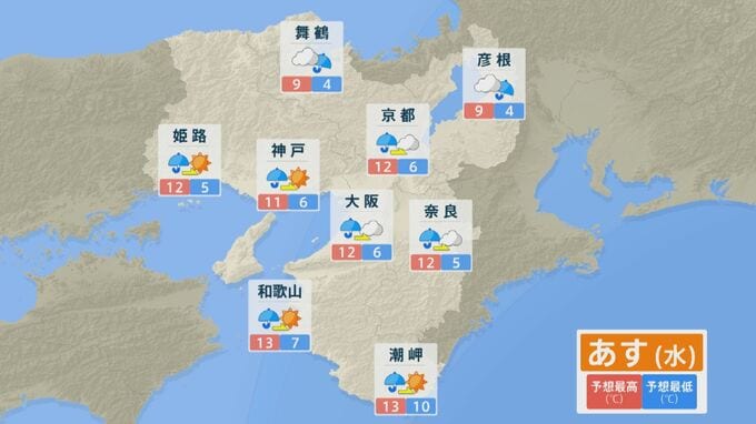 近畿は朝方を中心に雨の降り方が強まるでしょう。