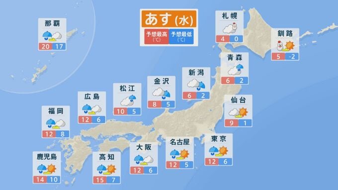 11日は、九州から東北にかけて広い範囲で雨が降るでしょう。一方で、低気圧が南から暖かい空気をもたらすため気温は高く、西日本から東日本では最高気温が10度を超えるところが多いでしょう。