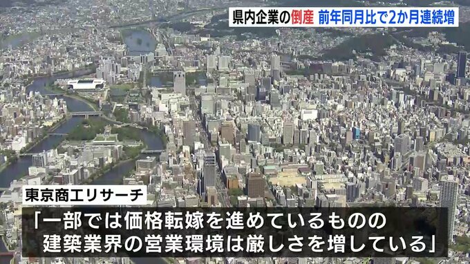 東京商工リサーチ広島支社によりますと、県内企業の1月の倒産件数は16件で、前年の同じ月に比べて2か月連続で増えました。負債総額は27億1900万円でした。産業別では、「建設業」や「小売業」が最多の4件で、原因別では、「販売不振」が最も多い結果となりました。新型コロナ関連の倒産は3件発生し、これまでの累計は320件となっています。