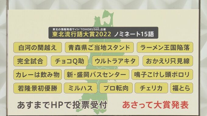 次は、東北の情報発信サイト「TOHOKU360」主催の「東北流行語大賞」。一般の方がホームページを通して応募することができ、それを編集部の方が15個にまとめました。12月22日までホームページで投票を受け付けており、12月23日に大賞が発表されます。
