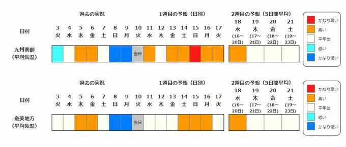 九州南部・奄美地方の向こう2週間の気温は、寒気の影響を受けにくいため高い日が多く、15日頃からは5日間平均気温平年差 +3.1℃以上の「かなりの高温」となる可能性があります。