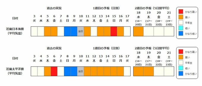 近畿地方の向こう2週間の気温は、寒気の影響を受けにくく暖かい空気が流れ込みやすい時期があるため高い日が多く、15日頃からは5日間平均気温が平年より2.7℃以上高い「かなり高の高温」となる見込みです。