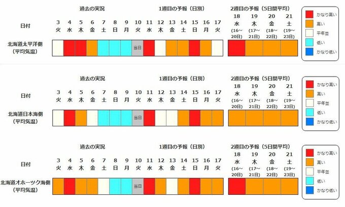 北海道地方の向こう2週間の気温は、寒気の影響を受けにくいため高い日が多く、15日頃からは5日間平均気温が平年より3.0℃以上高い「かなりの高温」となる可能性があります。
