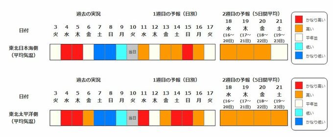 東北地方の向こう2週間の気温は、寒気の影響を受けにくいため高く、15日頃からは5日間平均気温が平年より2.4℃以上高い「かなりの高温」となる可能性があります。