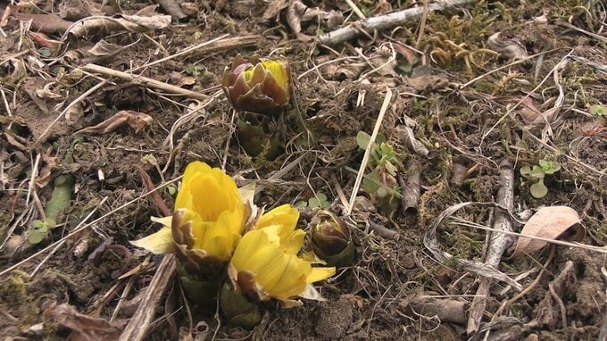 岩手県大船渡市の寺の境内に春を告げる花「フクジュソウ」の黄色い花が咲き始めました。