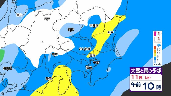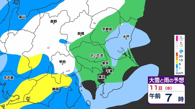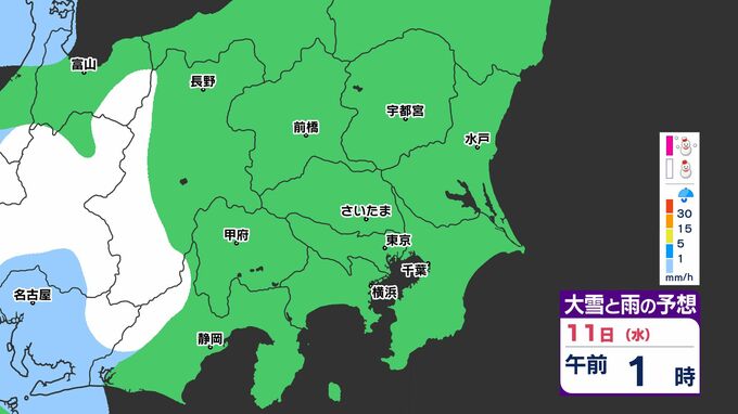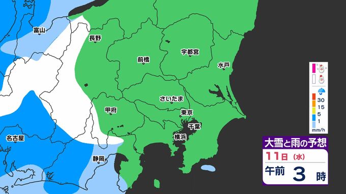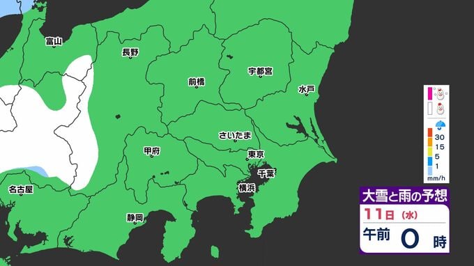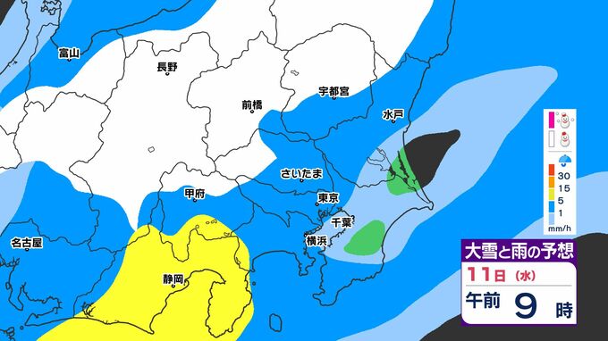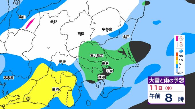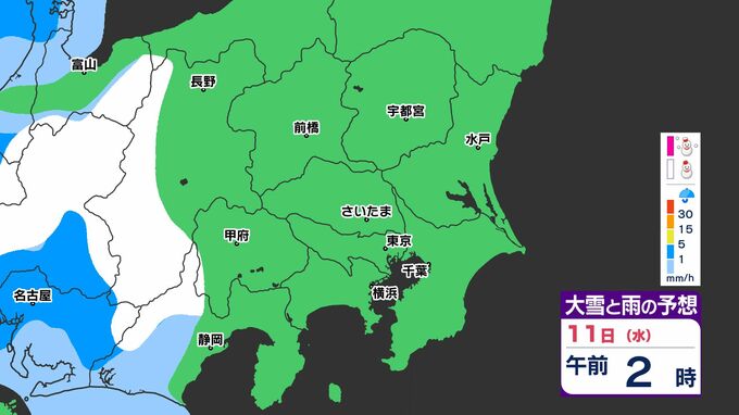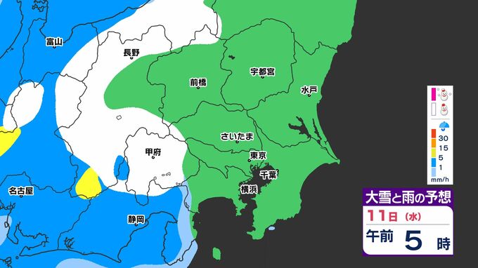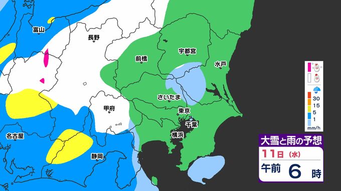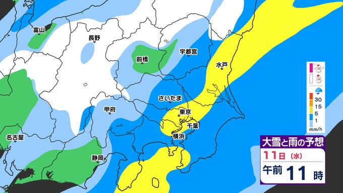 シミュレーションは雨と雪を予想しています。関東北部では「雪」ですが、関東南部は「雨」でしょう。