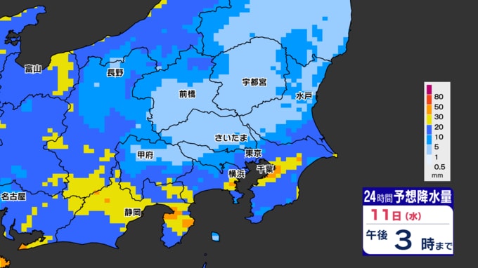 関東南部で20ミリ前後の雨になりそうです。東京の2月平年の雨量は56.5ミリ、横浜で64.7ミリなので、2月ひと月分の「3分の1」程度の雨になりそうです。