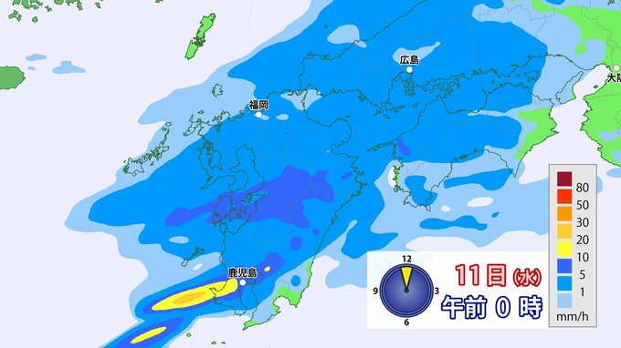 10日夜遅く~11日未明にかけては、鹿児島県など太平洋側でやや活発な雨雲が発生する可能性があります。