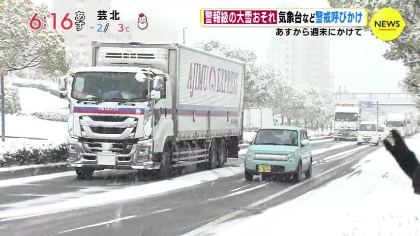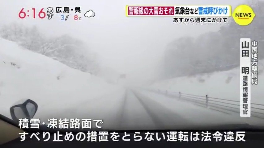 金曜の朝は、沿岸部でも特に広島市中心部など県の南西部では多少雪が積もる可能性があります。交通機関が大きく乱れることが予想されます。今後も最新の大雪情報の確認をお願いします。