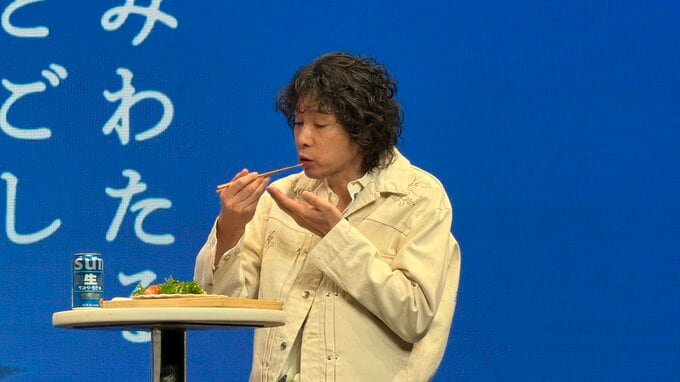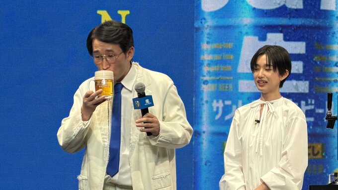 司会をつとめたシソンヌのじろうさんは河合さんから少し泡が多めに注がれたビールを受け取り、ゴクリ。〝沁みわたる喉ごしー!!!〟と製品のキャッチコピーを大声で叫び、感想を述べ会場の笑いを取っていました。