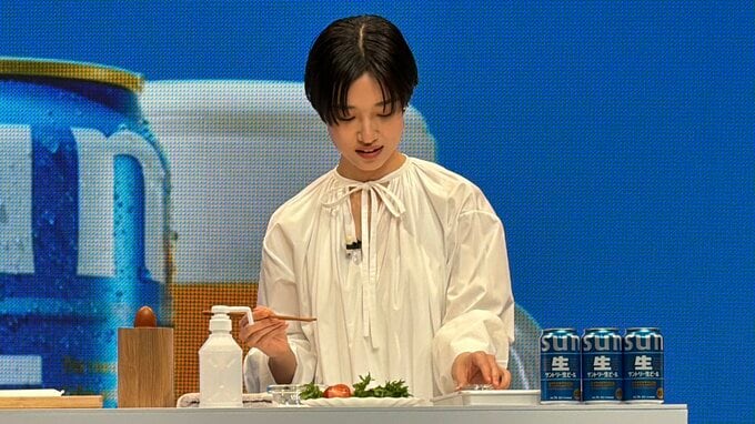 料理が大好きだという河合さんは、今回、新CMソング「上を向いて歩こう」の歌唱を担当する斉藤さんにお手製のおつまみを作って披露する場面も。