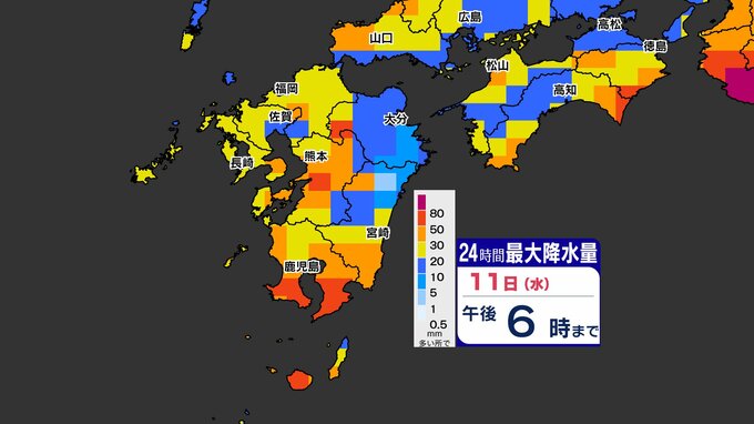 他の県は、気象台から雨量予想の発表はありませんが、低気圧と前線の進行方向の南側「九州南部の方が雨量が多く」なるでしょう。