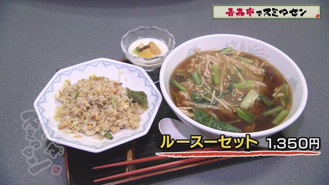 小野寺アナは【ルース―セット】(1350円)を注文。豚肉の細切りあんかけがのった醤油ラーメンと、野菜の旨味を活かしたお店こだわりのチャーハン、さらにデザートまでついてくる大満足のセットです。