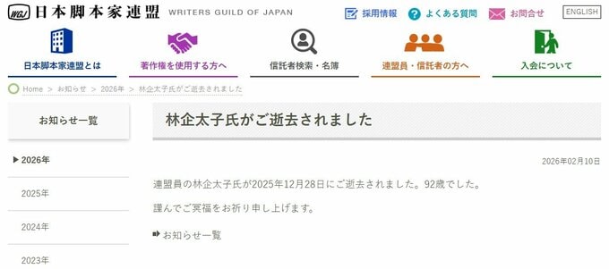 サイトの発表では「連盟員の林企太子氏が2025年12月28日にご逝去されました。92歳でした。謹んでご冥福をお祈り申し上げます」と、故人を追悼するコメントが掲載されました。