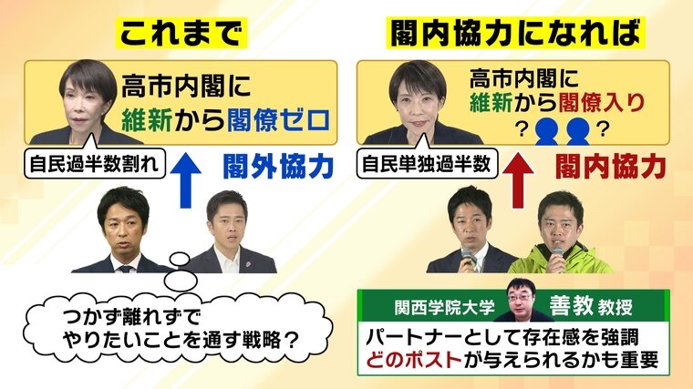 しかし、自民が単独過半数を獲得した今、維新としては、閣外協力を続けていては存在感がなくなり、維新の政策を進めることが困難になる恐れも。であれば、いっそ閣内に入り、大臣ポストを得ることで「連立のパートナーであること」を強調する戦略に舵を切る、という可能性があります。