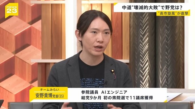 今回の無党派層の比例投票先で1位は、自民党で、2位は安野さんが率いるチームみらいが入っています。勢いが弱いとはいえ、野党第一党が少なくとも2位には入らないといけないはずです。