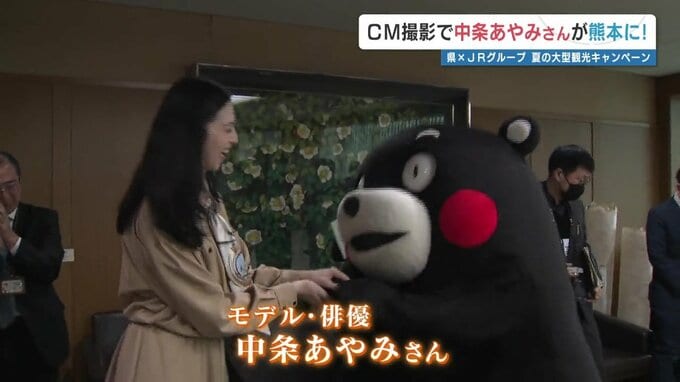 モデルや俳優として活躍中の中条あやみさんは、熊本県庁で、くまモンや木村敬知事から出迎えを受けました。