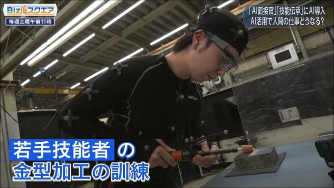 AIで熟練工の重心移動や腕の振り方をデータ化し、習得に20年必要と言われる金型加工技術の技能伝承の期間を5年に短縮することを目指している。