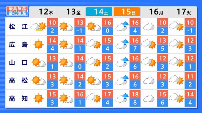 中国地方の向こう2週間の気温は、寒気の影響を受けにくいため高い日が多く、15日頃からはかなり高くなる可能性があります。