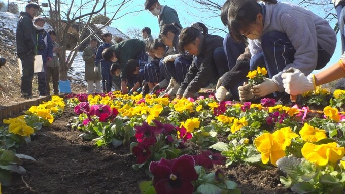 10日は6年生23人が甲州市の鈴木幹夫市長らとともに、みはらしの丘にパンジーとビオラの苗を植えていきました。