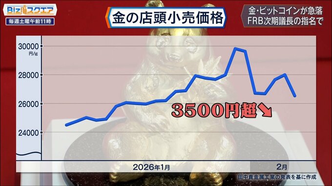 1グラム3万円の大台を突破し最高値を更新していた「金」が、2日、一転して急落。下げ幅は3500円を超えた。