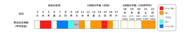 ・2週目の予報は中心の日に前後2日間を加えた5日間の平均(最高気温の5日間平均、最低気温の5日間平均、平均気温の5日間平均)です。平均期間を中心の日の下に表示しています。2週目のかなり高い(かなり低い)は、かなり高い(かなり低い)気温となる確率が30%以上のときに表示します。