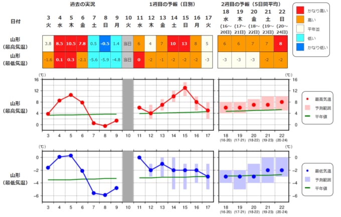 ・最近1週間の実況と今後2週間先までの気温の推移を表示しています。