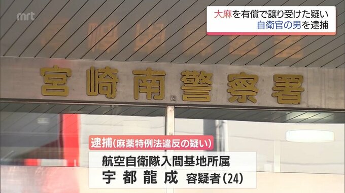 宮崎市の駐車場で大麻を有償で譲り受けた疑いで、埼玉県の航空自衛隊入間基地所属の自衛官が逮捕されました。麻薬特例法違反の疑いで逮捕されたのは、航空自衛隊入間基地所属の宇都龍成容疑者(24歳)です。警察の調…