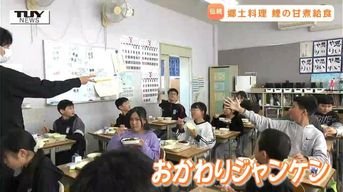子供の成長を願う縁起物としても知られる鯉。卒業まであとひと月、児童たちは鯉を食べて英気を養ったようでした。