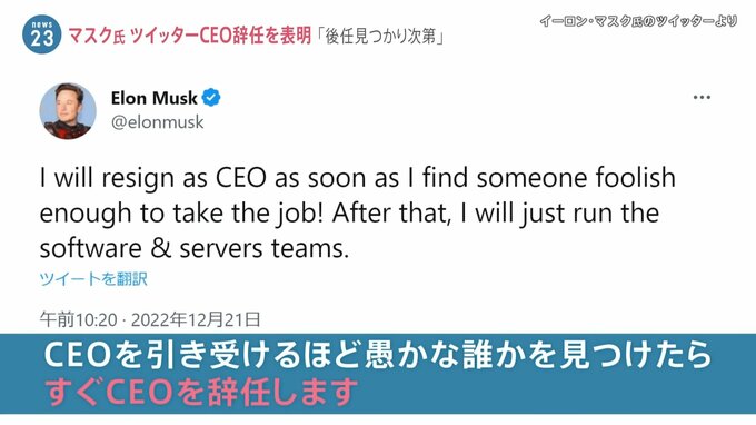 ■「引き受けるほど愚かな誰かを見つけたら」マスク氏ツイッターCEO辞任表明