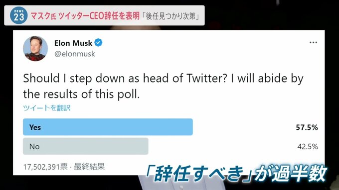 イーロン・マスク氏が日本時間の12月19日に、ツイッター上で行ったアンケート。1700万件以上の投票があり、結果は「辞任すべき」が過半数を占めました。