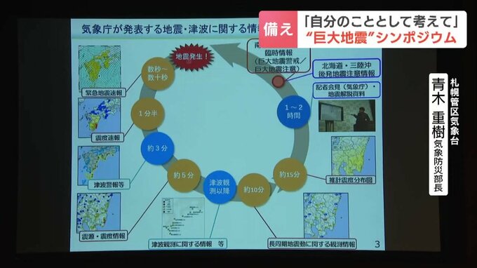 札幌会場では、札幌管区気象台の青木重樹気象防災部長が「北海道・三陸沖後発地震注意情報」など、東日本大震災の後に新しくできた地震や津波の情報発信制度などを説明しました。