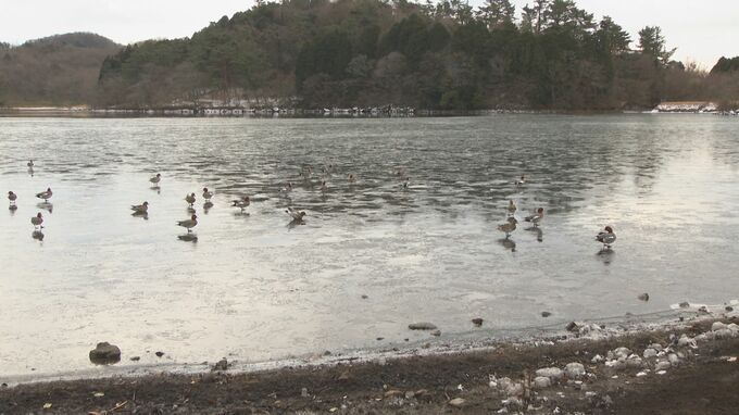 大分県別府市の志高湖は10日、湖面が凍結し、真冬の景色が広がりました。